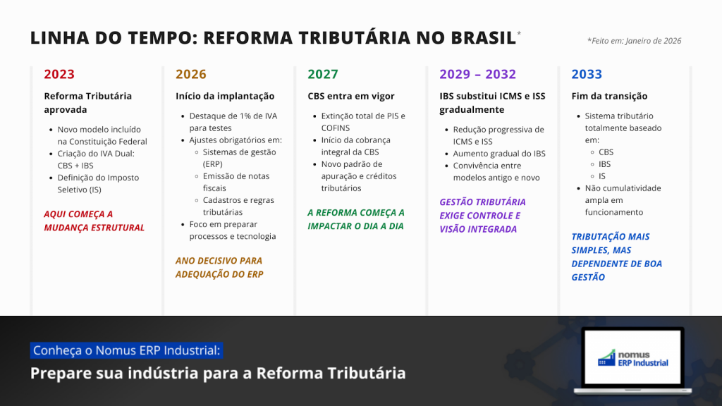 Caro cliente, como você já deve saber, a Reforma Tributária no Brasil já foi iniciada e tem como previsão de fim de transição no ano de 2033, com diversas etapas acontecendo ano a ano.